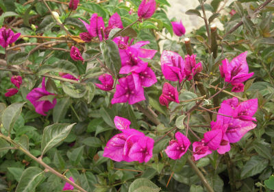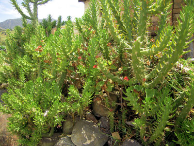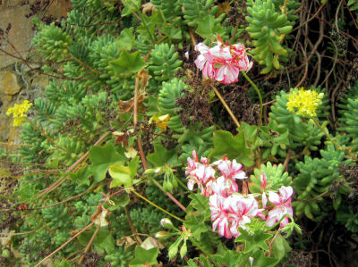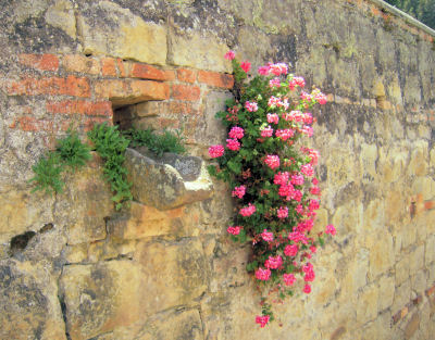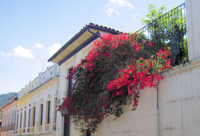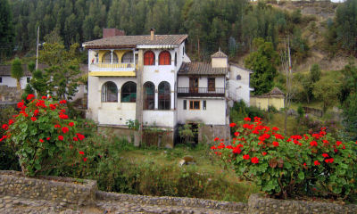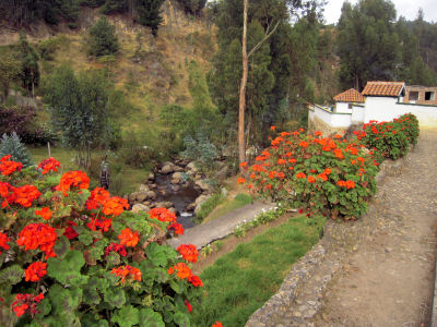 Geraniums and the (former) hotel across the bridge from our hacienda.