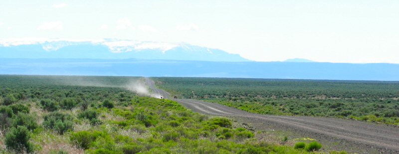 Mark (I think) heading west on the Hart Mt. road, with the Steens visible in the background (but foreshortened due to the telephoto effect).