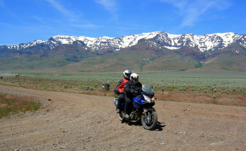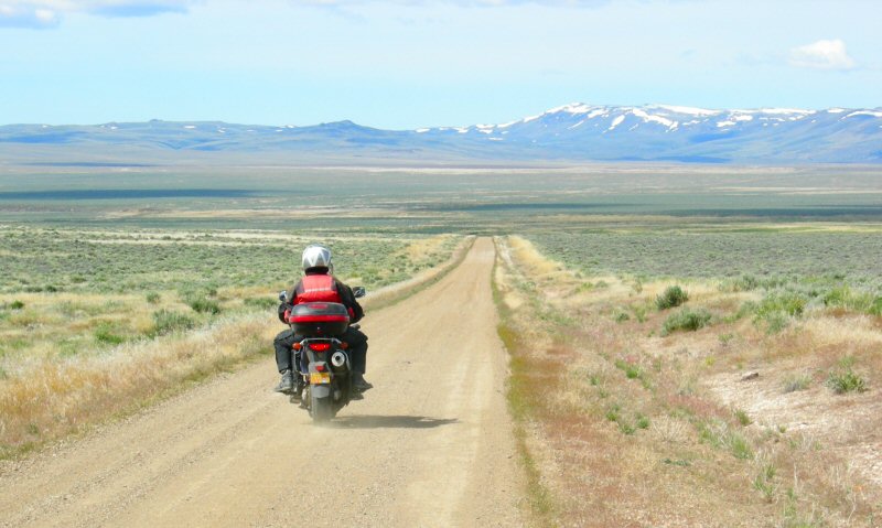 The dirt road had been driven by some vehicles earlier when it was wet and muddy, and was so deeply rutted and rough that it wasn't practical for a DL-650 two-up, so we backtracked and headed north on another gravel road where I took this shot looking south towards the northern end of the Steens.