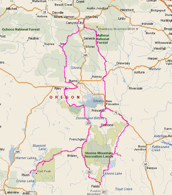 After a nice lunch and warming up in Burns, we headed out on 20/395 to Sage Hen Hill summit, where we turned south on "OO" road towards Harney lake. The photo above was taken just north of the lake where we turned back west to pick up OR-205 into Frenchglen. We lowered our tire pressure several times, and mostly all ran about 25psi on both ends.