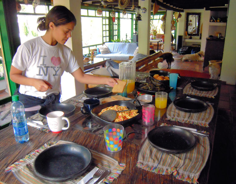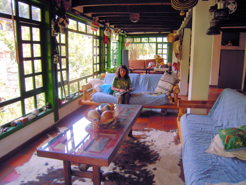 The living room of the house, with one of the many local kids enjoying the library of kid's books in Spanish which Than provides, and sometimes loans out. I'm collecting a box of such books myself to send to him to augment the library. By hanging out, the kids learn some English, and some ask if they can help out with minor household chores.