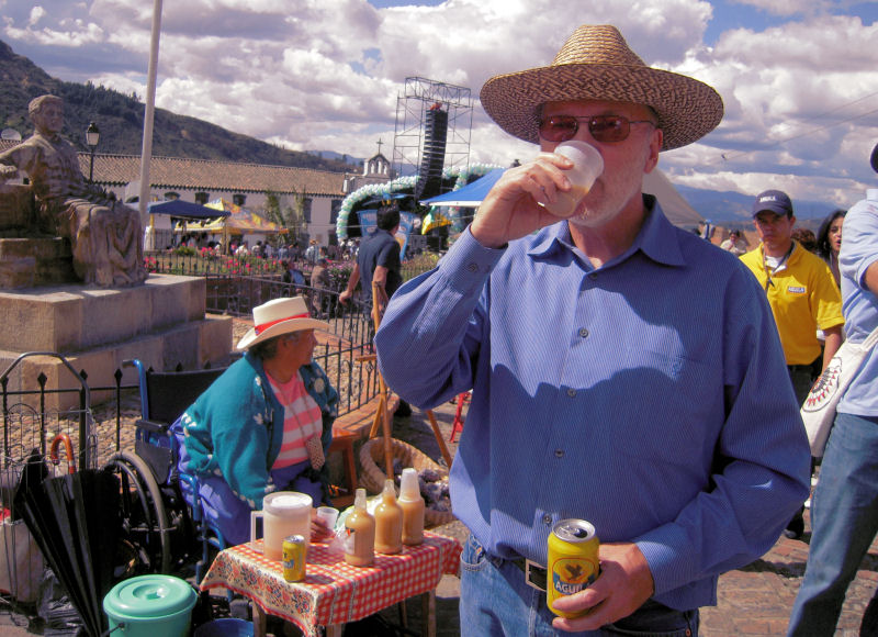 Yours truly drinking home made Chicha, an alcoholic beverage made from corn. In this case, by the woman in the white hat to my right rear. I don't think they ferment it by chewing the corn and spitting into it anymore. At least I hope not. Whatever — I didn't get sick. I was surprised it tasted way better than I expected. Fairly drinkable, even. Lala thought I was crazy to even try it. She's way smarter than I, she passed on it.