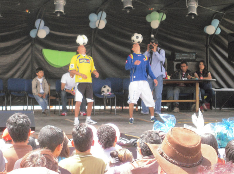 You also need some soccer stars. These two guys were the Colombian and Brazilian National Champions. They could do stuff with soccer balls I didn't know could be done. The guy in the blue jersey could hold the ball between his food and shin and do a standing back-flip without dropping the ball. They could both balance the balls anywhere on their bodies for as long as you want. Or bounce them continually with their feet, knees, shoulders and heads.