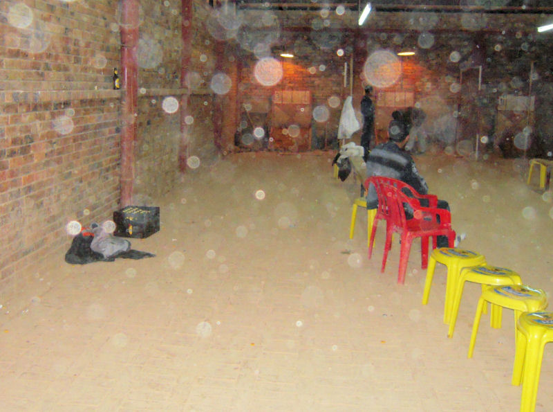 A crummy shot of one of the ends of a Tejo pit. Some call this the national sport of Colombia. [Here's a YouTube video explaining it in Spanish.] It involves massive quantities of beer, gunpowder, and throwing 4-5 pound chunks of metal and trying to cause explosions. Generally performed right next to another group of likewise engaged drinkers who might be throwing in your direction. Gotta be fun, right? I think the spots in the photo are particles of clay or gunpowder floating in the air. Sorry about that.