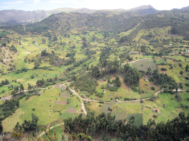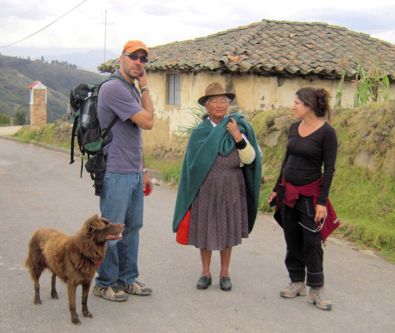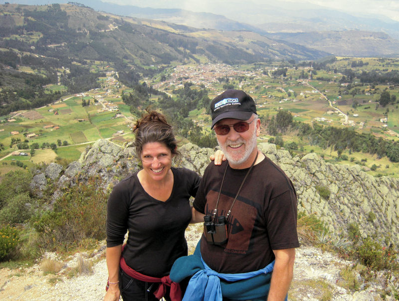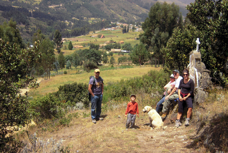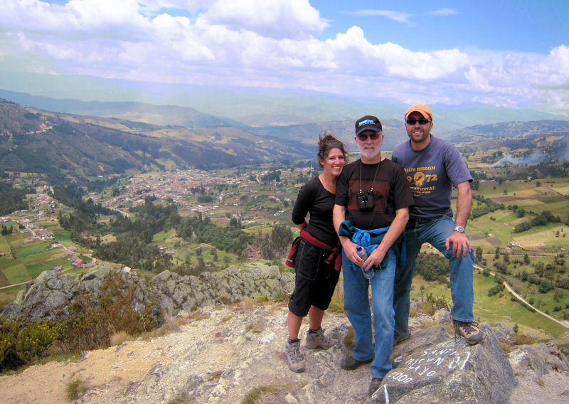 View from the Cross (though the actual top of the hill was another few hundred feet higher). Jen, me and Mark. Mongui to the left of and way below Jen. The Andes in all directions. Greenish polution in the background from the steel mill or coal burning in Sogamoso.