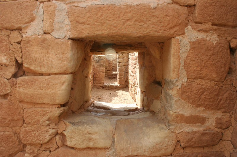 Sun Temple is a large above-ground pueblo built on the mesa top. I shot the above photo through one of its "windows". I imagine the light-colored mortar is from relatively recent repairs, whereas the rock-colored stuff is the original.