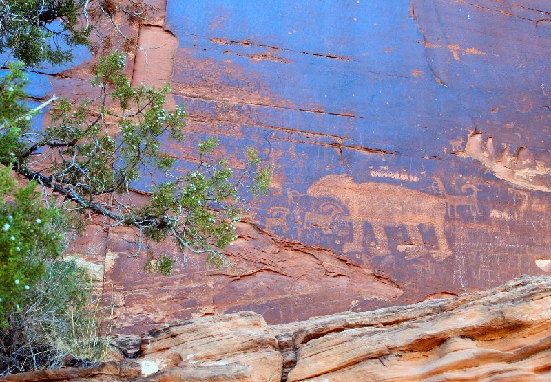 A few days later, I ended up in Moab, UT, where I rented a dirtbike and rode the Slickrock Trail. What a hoot that was! But later that same day, I rode down this 2-lane along the Colorado river downstream from Moab, and discovered some Indian petroglyphs visible from the road.